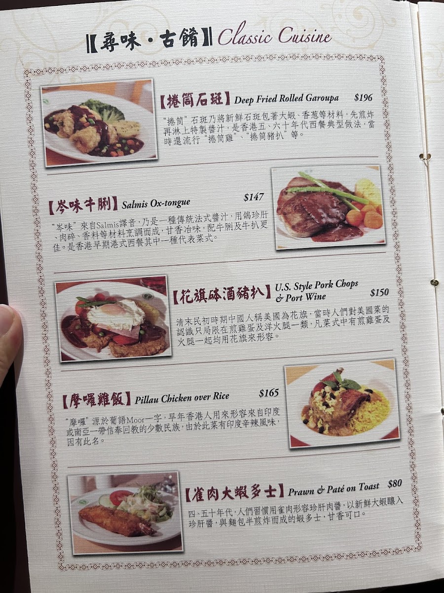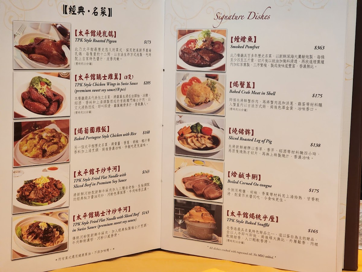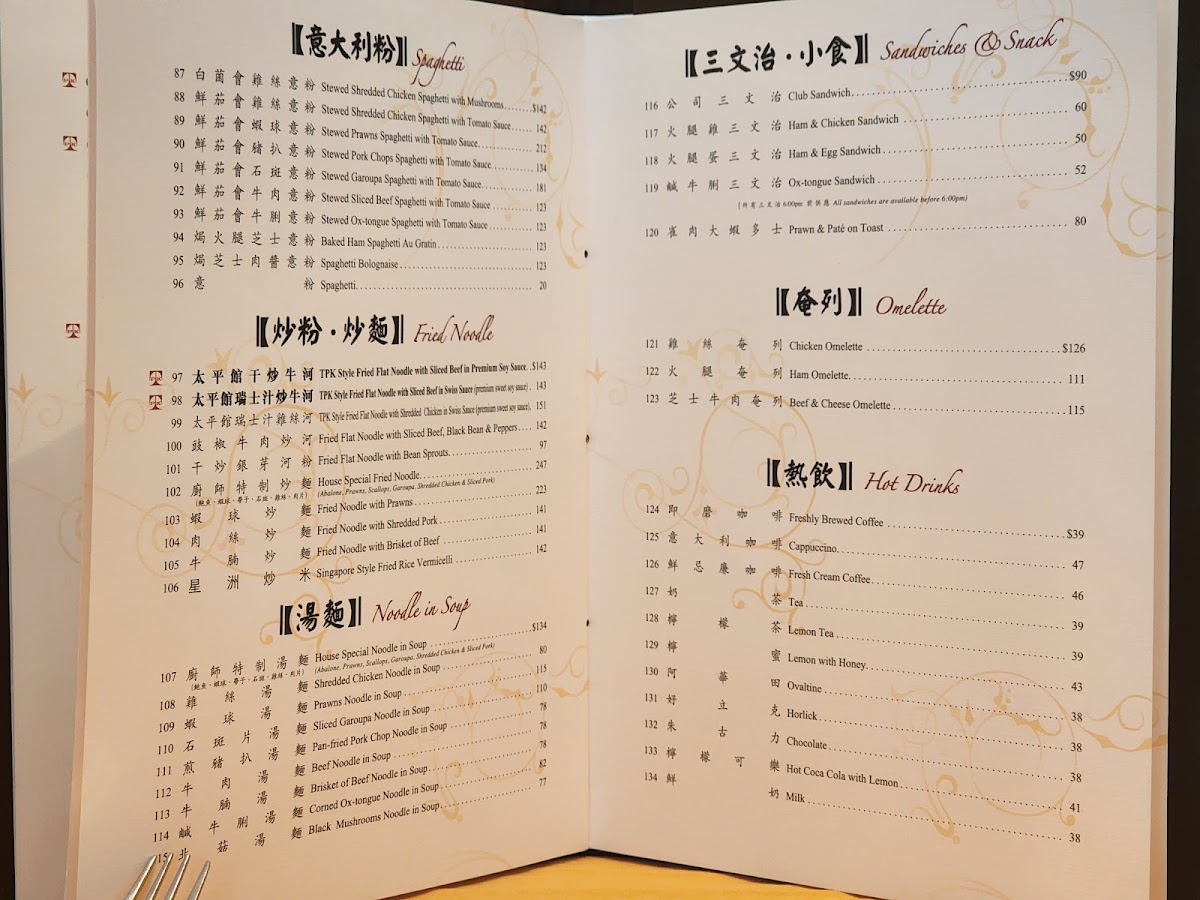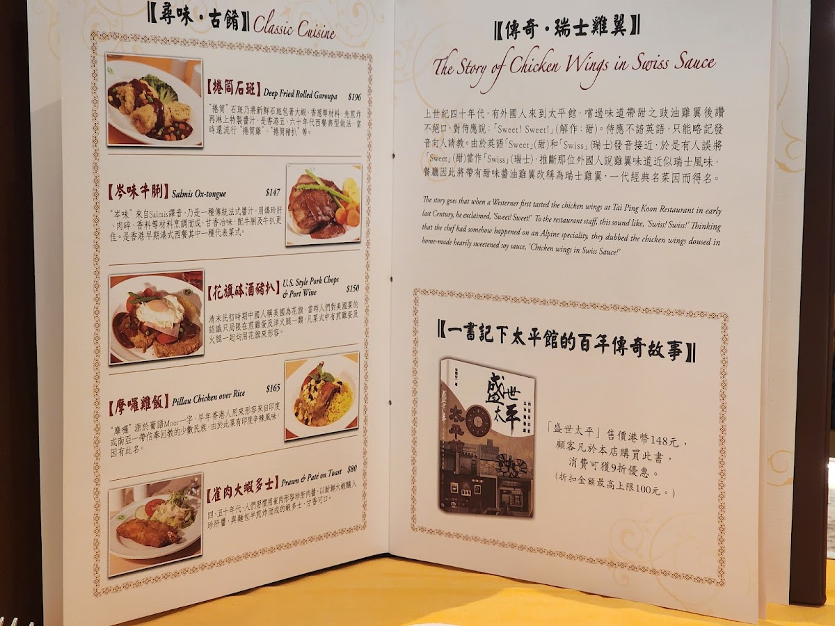 Tai Ping Koon Restaurant (Yau Ma Tei) offers a nostalgic dive into classic Hong Kong-style Western cuisine, famously known as 豉油西餐. The menu highlights timeless dishes such as their gigantic, perfectly baked soufflé, a must-try that impresses with its light, airy texture and generous portion—ideal for sharing. Another crowd favorite includes the Swiss chicken wings, loved for their sweet, savory glaze. For those seeking more hearty options, the roasted pigeon and ox tongue showcase the restaurant’s skillful fusion of Western techniques and local flavors.